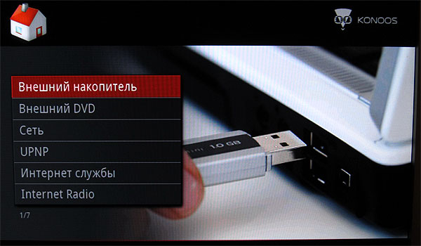Как видите, интерфейс тут простенький, но стильный. Плеер понимает различные внешние накопители, подключенные по USB (жесткие диски, флешки), также отдельным пунктом меню работает с внешним DVD, который может превратить MS-130 в обычный DVD-плеер.