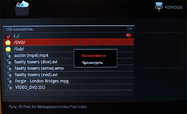 Структуру DVD понимает и при попытке войти в папку предлагает воспроизвести как фильм DVD. DVD одним файлом в ISO также понимает и также воспроизводит как фильм DVD. Что интересно, это не умеют делать очень многие плееры, причем даже дорогие. А ведь это базовая функция для коллекций на жестких дисках. Сколько раз сталкивался с тем, что медиаплееры вообще не понимали ISO. И некоторые устройства доходили до такого маразма, что не понимали папки с DVD и даже файлы IFO. Из серии - запускайте VOB, ребята, запускайте VOB.