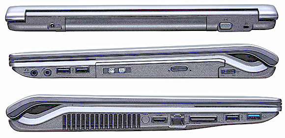 Задний торец - питание, VGA-выход, замок. Правый - наушники, микрофон, два USB 2.0, DVD-привод, включение/выключение беспроводных сетей. Левый торец - решетка кулера, HDMI, Ethernet, кардридер, USB 2.0, USB 3.0.