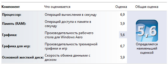 Идем смотреть табличку производительности. Сначала - стандартную от Windows 7. Получаем вот это.