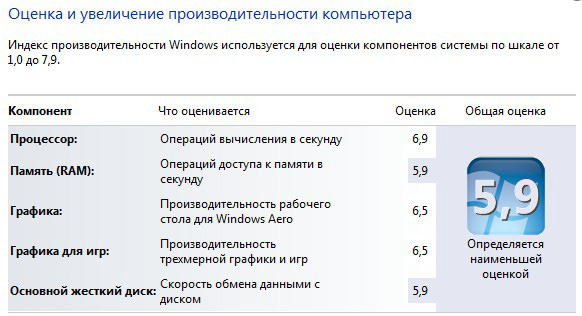 Жёсткий диск - 5,9 (это предел, как я понял, для ноутбуковых НЖМД).
