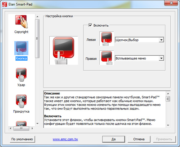 Тачпад - практически обычный, но здесь одна длинная кнопка, у которой различаются нажатия на левую и правую части. Насколько я помню, первыми это применили Apple, но сейчас они вообще отказались от кнопок, которые теперь спрятаны под полем тачпада.
