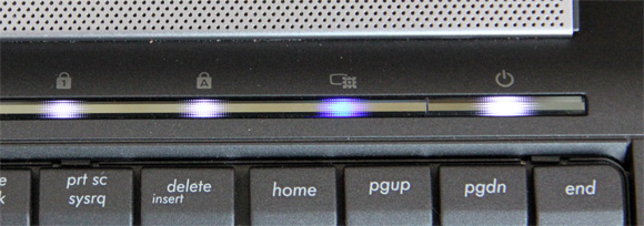 Над клавиатурой также идет линейка индикаторов/кнопок. В правой части - NumLock, CapsLock, индикатор режима видеосистемы (горит синим, когда работает встроенный графический адаптер, белым - когда работает дискретный адаптер), кнопка питания, она же - индикатор питания.