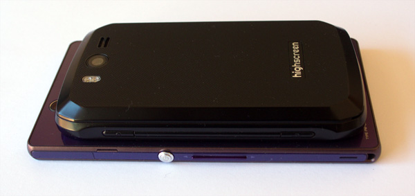 Так как дизайн смартфона изначально разрабатывался под емкую батарею, он выглядит не особенно толстым и смотрится явно лучше, чем, например, Samsung Galasy S III с китайской батареей и новой задней крышкой. Вот Highscreen Boost, лежащий на Sony Xperia Z.
