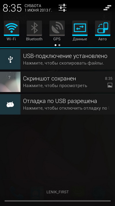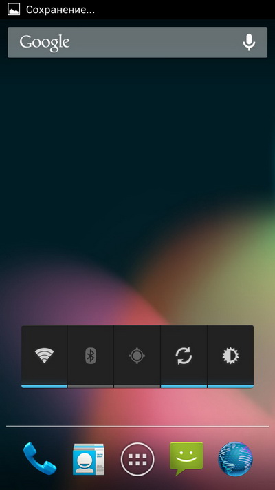 "В области уведомлений пять пиктограмм-переключателей: Wi-Fi, Bluetooth, GPS, мобильные данные, поворот экрана. "