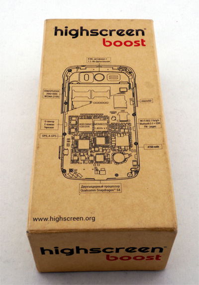 Поставляется смартфон в коробке с фирменным дизайном от Highscreen: на желтовато-картонном фоне демонстрируются внутренности жесточайшим образом препарированного телефона. С маркетинговой точки зрения эта дизайнерская идея заслуживает расстрела на месте через повешение - смотрится это все, как картинка из кунсткамеры. Но если у дизайнера была цель сделать так, чтобы коробку ни под каким видом не хотелось взять в руку, то этой светлой цели он, безусловно, добился.