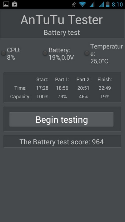 Надо сказать, что здесь нет никаких специальных средств экономии энергии, кроме стандартных андроидных, которые прекрасно известно, насколько "экономичны". Поэтому продолжительность работы держится исключительно на батарее двойной емкости по сравнению с обычными. Ну и плюс здесь не такой большой дисплей со скромным по нынешним временам разрешением - ему требуется не так много энергии.