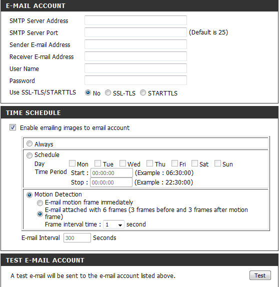 Почта - это все, конечно, хорошо, но если планируется получать немало скриншотов, тогда намного проще заставить камеру отправлять картинки на FTP - там отдельно будут приходить просто скриншоты по расписанию и скриншоты по датчику движения.
