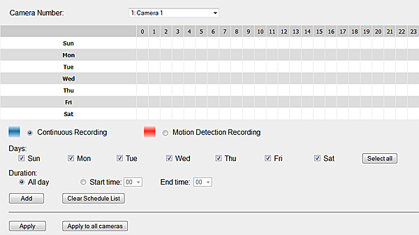 Также для каждой камеры довольно гибко можно настроить расписание видеозаписей или записей по наличию движения.
