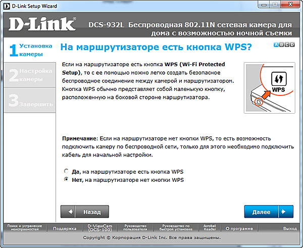 После этого задается вопрос по поводу настройки защищенного Wi-Fi-соединения. Эта камера поддерживает создание безопасного беспроводного соединения с помощью кнопки WPS. Если такая кнопка есть на роутере, то этой возможностью можно воспользоваться.