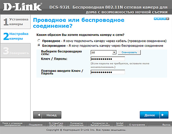 После этого нужно выбрать вид подключения камеры. Если выбирается беспроводное подключение, то нужно выбрать соответствующую сеть и задать пароль (если он включен).