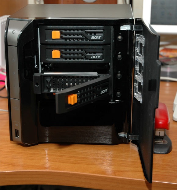 Установка и замена жестких дисков в easyStore производятся крайне удобно. Нужно открыть переднюю пластиковую крышку, скрывающую четыре фрейма для дисков, вытащить фрейм, вставить в него жесткий диск, после чего всунуть фрейм обратно и зафиксировать с помощью простейшего рычажного механизма. Вся процедура занимает несколько секунд.