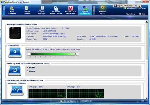 Так как Acer Aspire easyStore H340 работает под управлением операционной системы Windows Home Server, о которой я уже писал отдельную большую статью, подробно говорить о том, как производятся управление сервером, настройка дисков, папок, видов доступа и так далее, я не буду. Остановлюсь только на том, чем данная версия WHS отличается от той, которую я рассматривал.