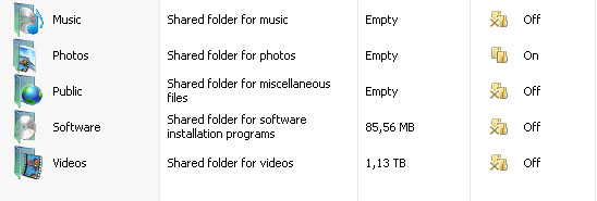 В процессе работы наступил на забавные грабли. Дело в том, что WHS умеет дублировать папки (при более чем одном установленном диске). То есть делать автоматическое зеркалирование конкретных папок, и это зеркалирование обязательно производится на другой физический диск. Проблема в том, что по умолчанию опция дублирования включена. Я этого не заметил и стал заливать всю коллекцию видео в High Definition на серверные диски. А там в коллекции - более терабайта. В результате место закончилось довольно быстро и сервер стал выдавать сообщение о невозможности сделать копию закачиваемых данных. Я отключил опцию дублирования - но тогда сервер стал показывать, что лишний терабайт занят под системные файлы. То есть автоматом кривоватый дубль не уничтожил (а зря). Пришлось удалять все закачанные в эту папку файлы - только тогда были удалены дубли. Так что не наступите на эти грабли!