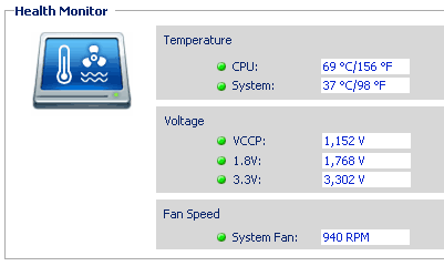 Бесшумность серверу обеспечивает система охлаждения. У процессора охлаждение пассивное, но весь сервер с правой стороны обдувается здоровенным и, соответственно, очень тихим кулером в 120 мм. (Там есть еще маленький кулер на блоке питания и кулер побольше на левой стенке. Они также практически бесшумные.) Температура сервера под нагрузкой при этом вполне терпимая, а температуры материнской платы и дисков за норму не выходят.