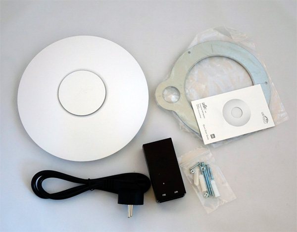 Точка доступа UniFi представляет собой симпатично выглядящий "блинчик" 20 сантиметров в диаметре, который лучше всего крепить на стену или на потолок: на потолке он выглядит как динамик или как датчик дыма. Впрочем, понятно, что устройство можно также просто держать на столе.