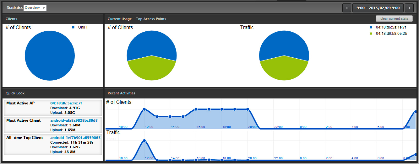 В UniFi Controller собирается самая разнообразная статистика по точкам и подключенным клиентам.
