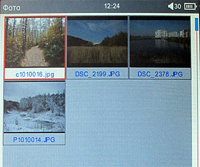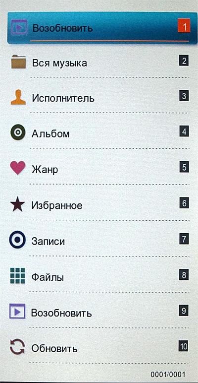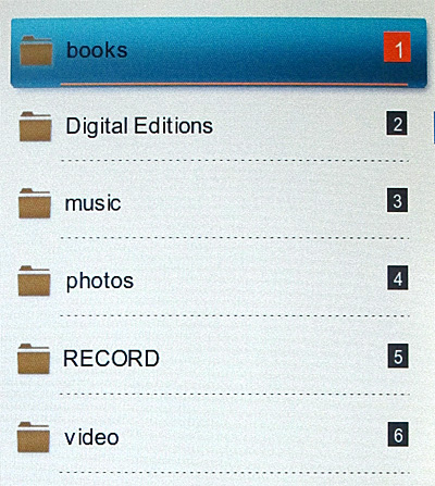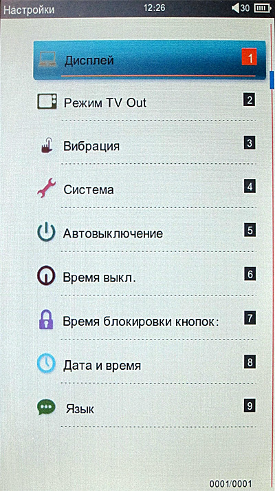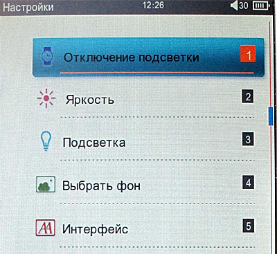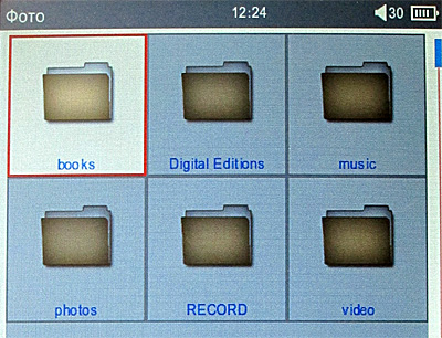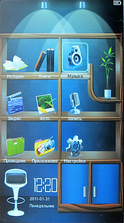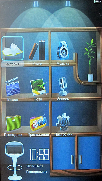 Тем не менее на самом деле все то же самое - девять основных пиктограмм, между которыми можно перемещаться клавишами джойстика: история открытых книг (именно книг, а не всех медиафайлов), книги, музыка, видео, фото, запись, проводник, приложения, настройки.