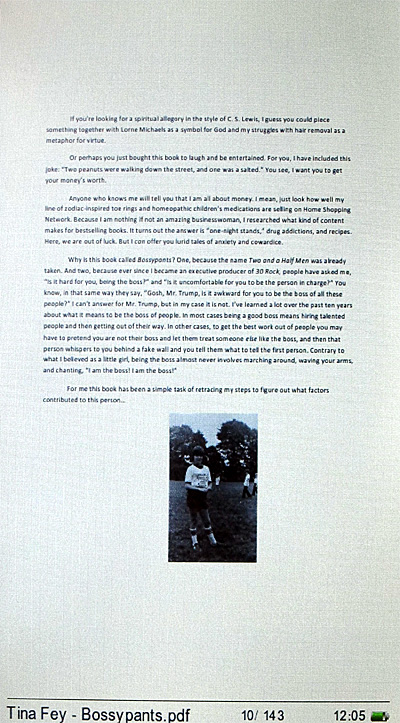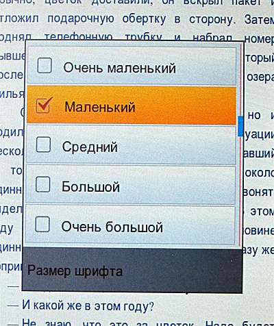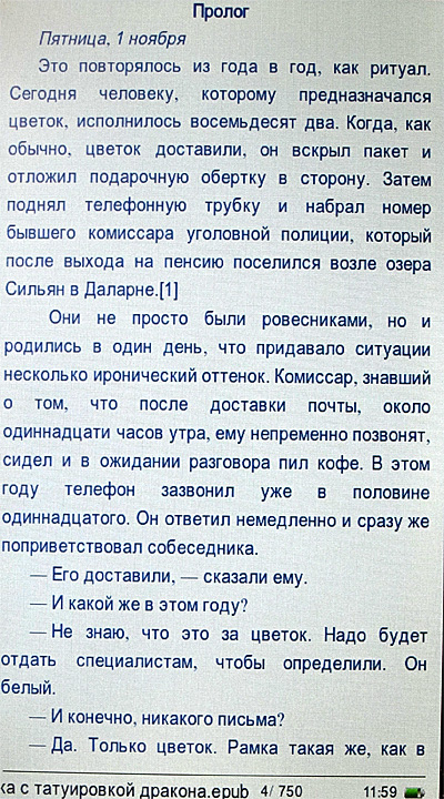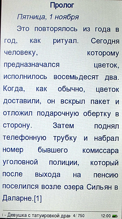 Из явных странностей, проявившихся в обоих форматах, - непонятные переходы на новую страницу, когда остается от четверти до трех четвертей чистого листа, причем практически только при размерах кегля "маленький" и "средний". Когда ставишь "очень маленький" (вполне, замечу, читаемый) - этого нет и в помине. Похоже просто на некоторый глюк программного обеспечения: страницы разбиваются в режиме "очень маленький", а если ставится другой шрифт, там почему-то сохранятся разбиение на страницы от "очень маленького". Не смертельно, но, конечно, неприятно, когда страница вдруг разрывается ни с того ни с сего.