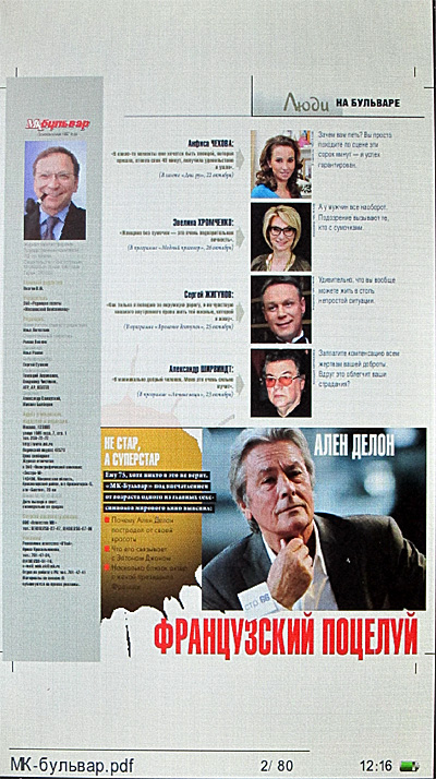Углы обзора у экрана - не фонтан: при повороте что по вертикали, что по горизонтали изображение очень быстро меркнет и теряет контрастность. Впрочем, когда используешь ридер один, это проблемой, как правило, не является, а вдвоем его смотреть просто неудобно - экран-то всего семь дюймов.