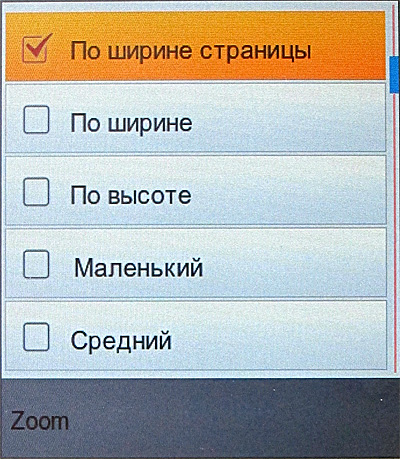 В меню нет перехода на альбомный режим, однако он тем не менее вызывается: если нажать и подержать секунду кнопку масштаба шрифта. Впрочем, для этих форматов переход в альбомный режим имеет мало смысла.