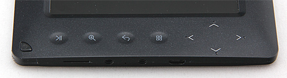 На нижней панели расположены следующие кнопки (слева направо): питание, воспроизведение-пауза (она же - Enter), изменение масштаба, возврат (она же - Esc), меню и четырехпозиционный джойстик (они же - листание страниц и регулировка звука).