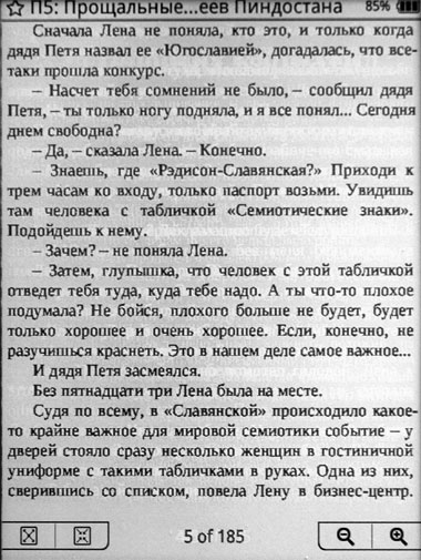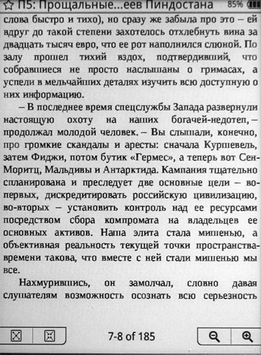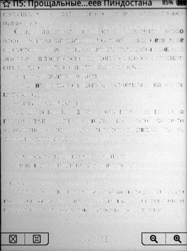 Понятно, что такой режим сделан для экономии энергии аккумулятора - при неполном обновлении страницы электричества тратится меньше. Но лично я бы предпочел, чтобы ридер тратил больше энергии, но каждую страницу обновлял полностью, потому что эти треки - они реально раздражают. Причем насколько сильно текст будет загрязнен, очень зависит от характера текста и действий с ним. Иногда у меня получался вот такой вот громкий ужас.