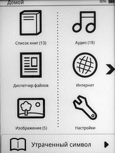 При включении выключенного ридера сначала возникает заставка Mr. Book, а затем появляется следующий основной экран.