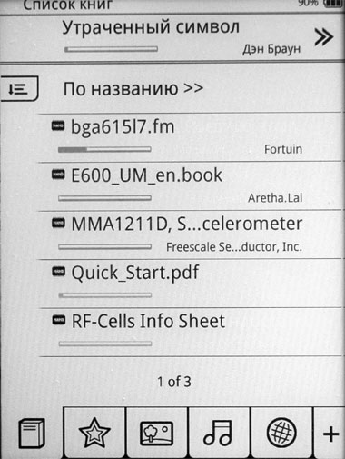 Сверху идет последняя читаемая книга, ниже - список загруженных на устройство книг. Из папок ридер список читает, но сами папки не различает, что достаточно грустно. В режиме просмотра списка доступна сортировка по названию, автору, дате публикации и дате загрузки. Изменить вид списка невозможно, и это очень даже плохо, потому что на экране одновременно помещается всего пять названий, так что если вы загрузите, например, тысячу книг (два гигабайта памяти это вполне позволяют сделать), то флаг вам в руки листать двести страниц наименований. Поиск по названию тут есть, но он поддерживает только английскую клавиатуру, так что не судьба.