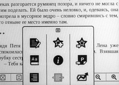 Пиктограммы там следующие: написать примечание, поставить закладку, вызвать примечания/закладки, найти текст, информация о файле, перейти на страницу, вызвать оглавление, задать режим чтения, включить-выключить режим энергосбережения.