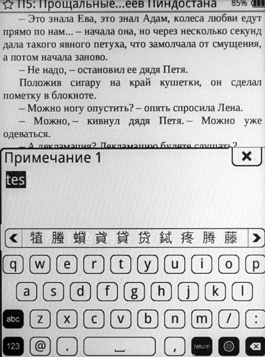 Примечание пишется с помощью экранной клавиатуры, которая поддерживает только латиницу. Правда, при вводе текста автоматически появляются подсказки в виде иероглифов, что, конечно, сильно облегчает ввод текста для китаеамериканских пользователей.