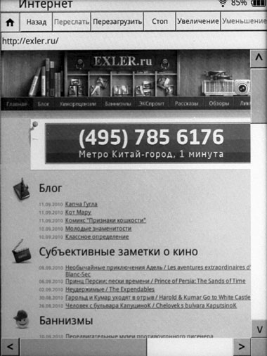 У ридера есть модуль Wi-Fi, который нормально подключается даже к защищенным Wi-Fi-сетям. При наличии подключения к Сети можно заходить на какие-то сайты. Есть предустановленный набор сайтов, но вы также можете вбить любой адрес.