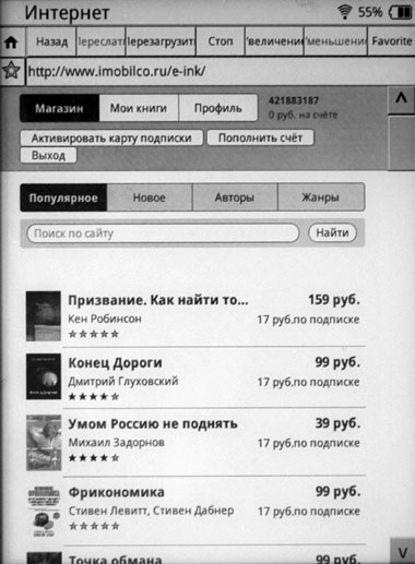 Раздел магазина, судя по всему, специально создан под читалку, однако пользоваться этим практически невозможно - длиннющую страницу приходится скроллировать, что в условиях экрана ридера занятие совершенно нетривиальное, а найти нужную книгу невозможно по причине отсутствия русской клавиатуры. Оплачивать покупку можно со своего счета на сайте, с помощью SMS (при этом в три раза переплачиваете) или с "Яндекс.Кошелька", если вы используете онлайновую версию, а не клиент.