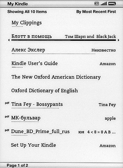 Главный экран у Kindle традиционно аскетичный: просто список загруженных книг, отсортированный по дате доступа.