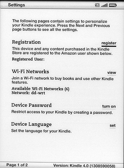 Settings - всякие мелкие установки: регистрация в магазине Kindle Store, настройка Wi-Fi, установка пароля на устройстве и выбор языка интерфейса, среди которых русского нет.