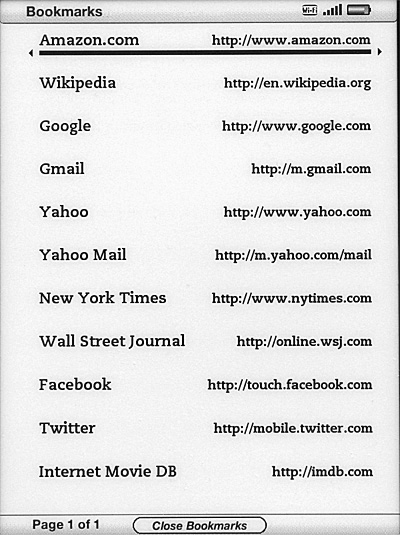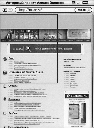 Для браузера есть список закладок, но можно ввести и свой адрес. Реально пользоваться браузером тут почти невозможно. И на сенсорном-то экране ридера с браузером особо не разгуляться, а тут еще и экран несенсорный.
