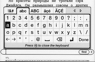 При нажатии на кнопку клавиатуры появляются форма для быстрого поиска и экранная клавиатура. Которая, разумеется, абсолютно бесполезна для текстов на русском - кириллицы там нет.
