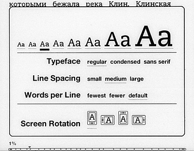 Тут все как обычно: восемь кеглей, три гарнитуры, три вида расстояния между строк, три вида полей - вполне достаточно для комфортной настройки. При выборе нового параметра изменения тут же отображаются в тексте.