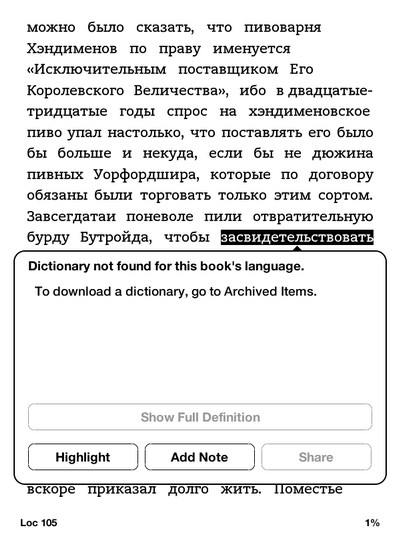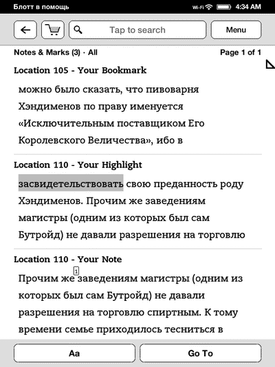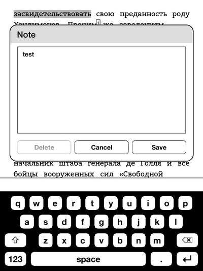 При нажатии кнопки Highlight (выделить) слово останется выделенным. При нажатии кнопки Add Note (добавить заметку) к этому слову можно будет добавить заметку (только латинскими буквами).
