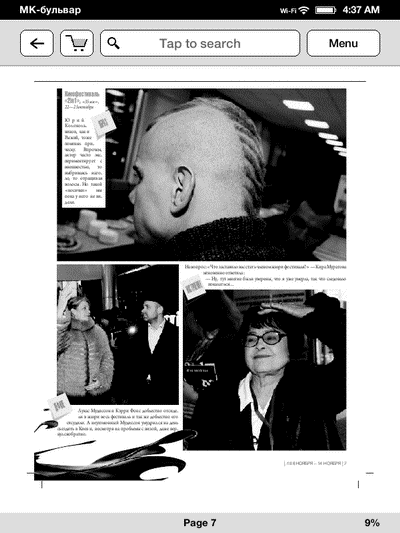 Посмотрел, как читается PDF. Как обычно, на таком экране даже верстка в формате А5 читается крайне сложно. Масштабирование пальцами тут вроде как поддерживается, но это все делается так медленно и так неудобно, что смысла никакого в этом не вижу. Так что в PDF можно читать разве что документы-книжки, сверстанные под соответствующий размер экрана ридера - вот с ними никаких проблем.