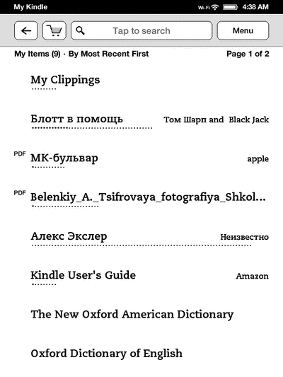 Как во всех остальных Kindle, закачка книг в ридер делается очень просто: ридер подключается к компьютеру кабелем USB, после чего становится виден как внешний диск. Туда и закачиваются книги - можно в корневую папку документов, можно в подпапки - ридер их понимает. Названия кириллицей воспринимаются нормально. Я загрузил несколько изданий для теста.