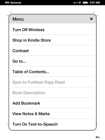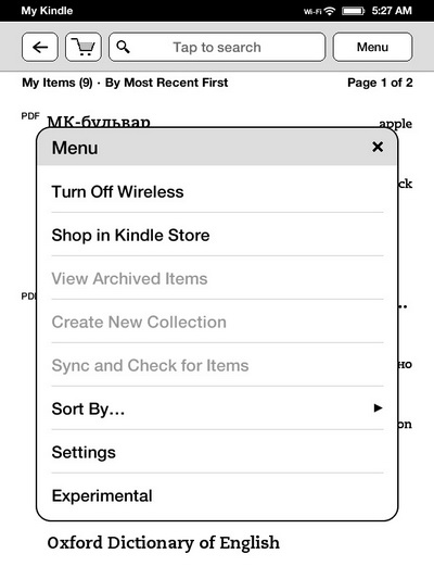 В меню есть следующие пункты: включить/выключить Wi-Fi, посетить книжный магазин, посмотреть архивированные наименования, создать новую коллекцию, синхронизировать и проверить наименования, сортировать, установки, экспериментальные приложения.