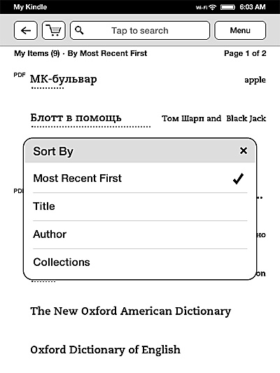 Главная страница Kindle Touch почти не изменилась - простой список книг.