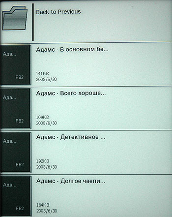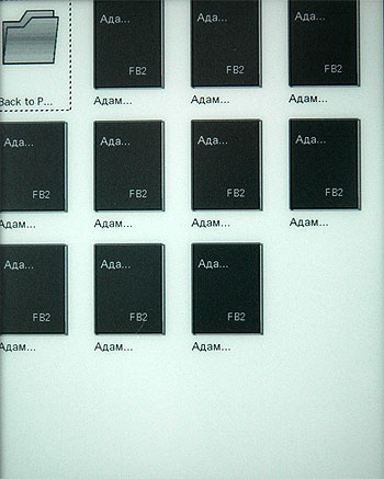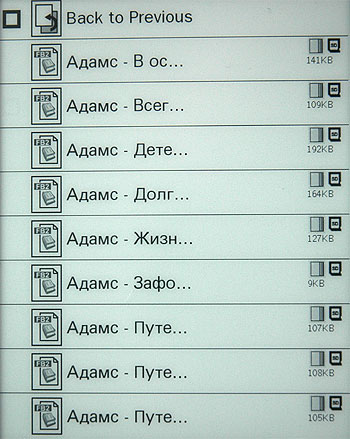 Выяснилось, что в режиме "Список" информации на экран помещалось, конечно, побольше, однако она - сюрприз, сюрприз! - также обрезалась строго по центру экрана. А так как там еще и буквы использовались большего размера, от названий книг оставался гулькин пенис.