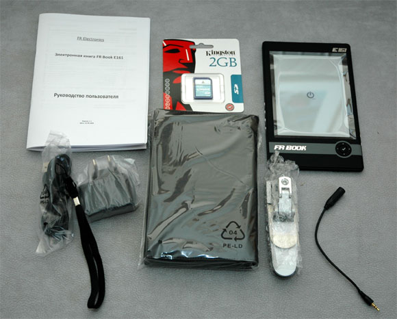 Надо сказать, что FR Book поставляется в нетипично большой коробке, обычно ридеры упаковываются значительно более скромно. Но когда коробку открываешь, сразу понимаешь, что тут объема нагнали не зря - комплектация на редкость богатая. Тут тебе и SD-карта на 2 Гб, и прищепка-подсветка, и футляр, и петелька для ношения устройства, и кабель USB с адаптером под 220 вольт, и переходник под наушники с джеком 3,5 мм, и руководство пользователя. Вот это я понимаю - комплект. А то вон в Cybook Opus даже грошовый переходник под 220 вольт пожлобились положить, и это при вполне полноценной стоимости.
