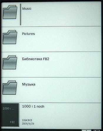Закачал книжки FB2 во внутреннюю память, начал смотреть, как это все работает. По умолчанию список файлов и папок дается в следующем виде.