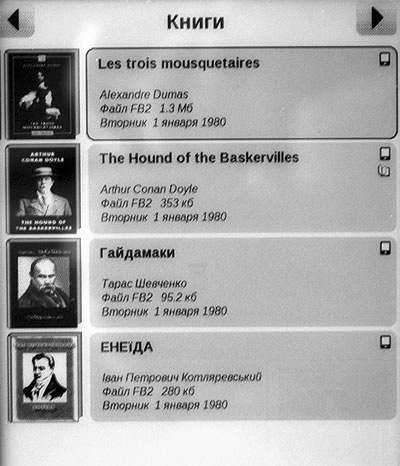 Боковые клавиши листания страниц в списке работают своеобразно: кнопка "Следующая страница" работает как Enter, то есть или входит в папку, или открывает файл, а кнопка "Предыдущая страница" работает как Home, то есть выводит на предыдущий уровень. Причем так работают правые кнопки листания. На левые в списке ридер вообще никак не реагирует. А зря, сделали бы перемещение курсора вверх-вниз - это было бы очень удобно.
