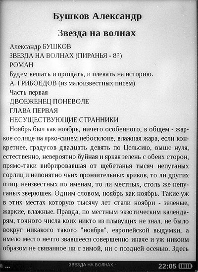 Так вот. Тут у меня для вас есть две новости. Одна - безусловно, хорошая. Создатели PocketBook 302 добились того, что сенсорная пленка вообще никак не влияет на контраст и яркость изображения. Та самая мерзкая молочная муть, которая так раздражала нас (я имею в виду меня с котом Бубликом) в моделях PRS-600, 700 и 900, здесь отсутствует вообще! Экран контрастный и яркий, текст в принципе ничем не отличается от экрана, например, Pocketbook 360. И это очень даже хорошо, даже отлично!