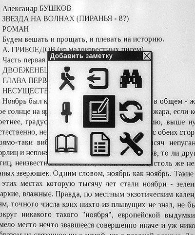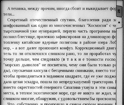 Сначала о листании страниц. Вы можете их листать клавишами слева-справа - это, в общем-то, удобно. Так же, как и в Sony Reader, страницы можно листать жестом справа-налево или слева-направо в нижней части экрана - пальцем или стилом. Жесты снизу вверх приводят к увеличению шрифта, жесты сверху вниз - к уменьшению.