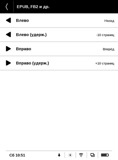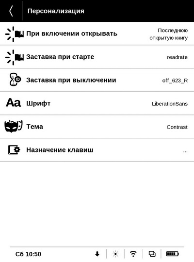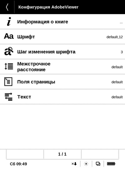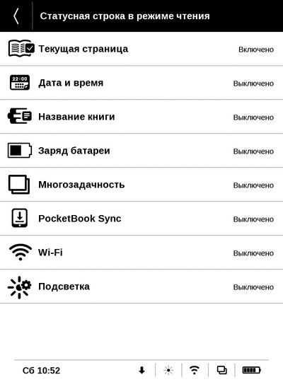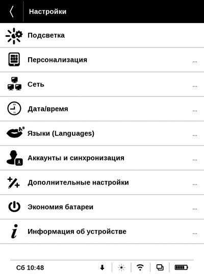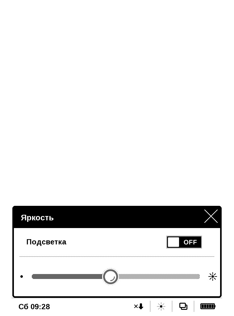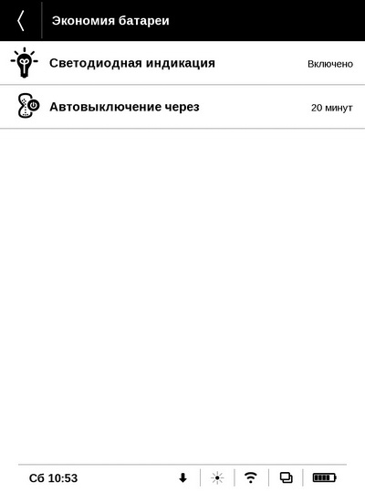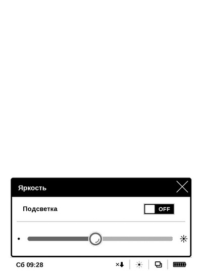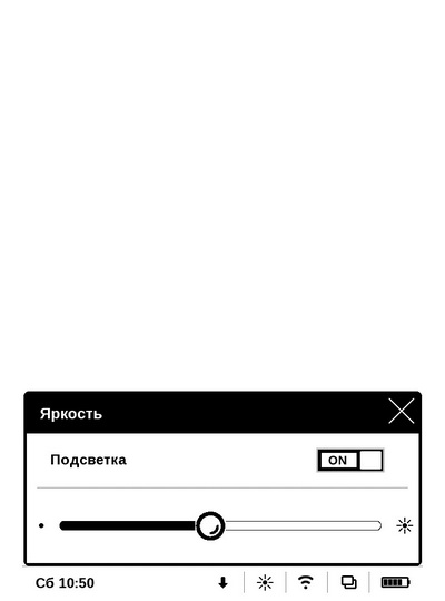 Вторая пиктограмма - включение и регулировки подсветки ридера. Надо сказать, что подсветка здесь - очень качественная. И она сделана по единственно правильному принципу: восемь светодиодов освещают торец специальной прозрачной пленки, которая от этого светится приятным равномерным светом, освещая дисплей под собой - точно так же сделано у Nook Simple Touch with GlowLight, и это смотрится очень хорошо. Так что нововведение во второй модели - очень даже ценное.